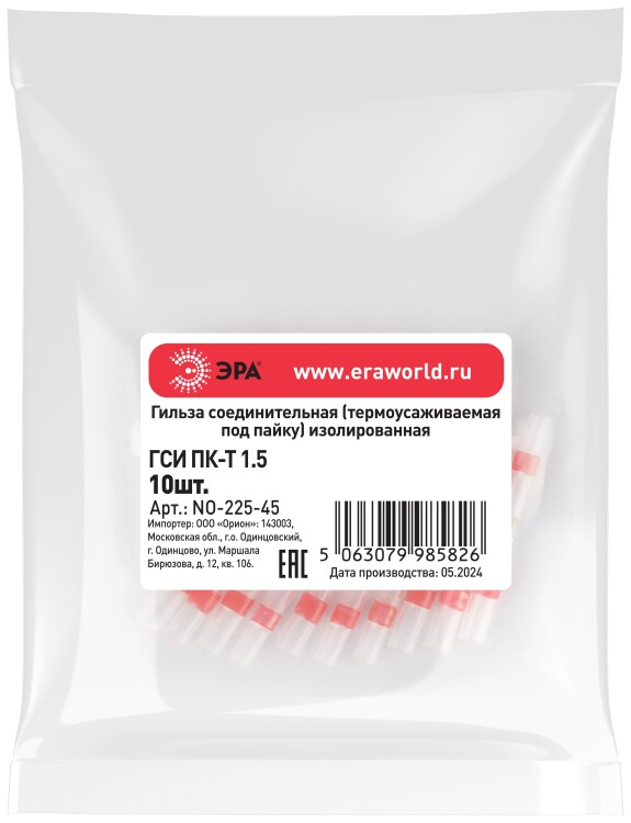 Гильза соединительная ЭРА NO-225-45 термоусаживаемая ГСИ ПК-Т 1.5 изолированная под пайку (упаковка 10 шт.)