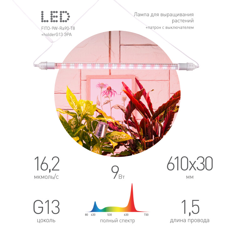 Светильник для растений, фитолампа светодиодная линейная ЭРА FITO-9W-Rа90-Т8+FITO-Holder IP65 2хG13 с выключателем, 1.5м