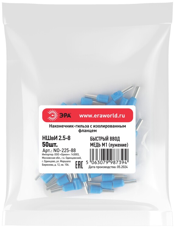 Наконечник-гильза ЭРА NO-225-88 НШвИ 2,5-8 с изолированным фланцем (упаковка 50 шт.)