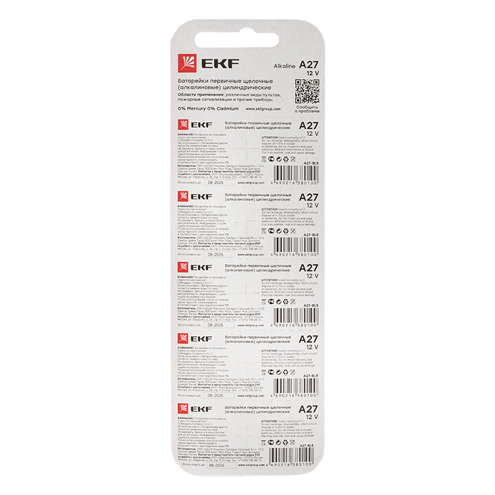 Алкалиновая батарейка типа А27 для сигнализаций блистер 5шт. EKF