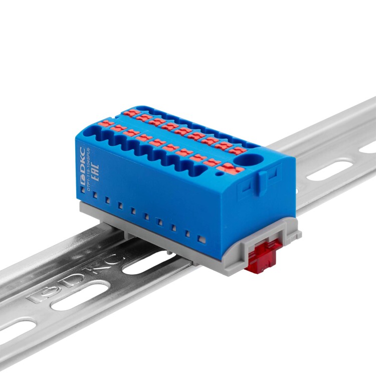 Блок распределительный с верт. адаптером на рейки шириной 15/35мм, зажим push-in, 1 ввод 6 кв.мм, 18 точек подключения 2,5 кв.мм, синий