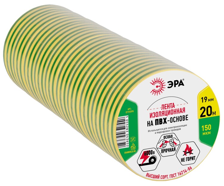 Изолента ПВХ желто-зеленая 19 мм х 20 м (модель 43669/43652)