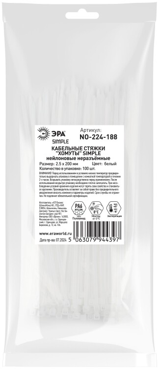 Кабельная стяжка ЭРА NO-224-188 (хомут) нейлоновая 2.5 х 200 мм белая (100 шт/уп) Simple