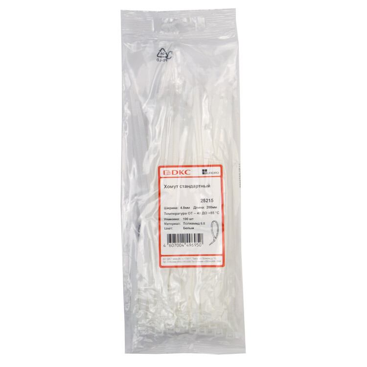 Хомут кабельный (стяжка) 200ммx4.8ммx1.35мм с внутр. зубчатым зацеплением пластик белый макс.d охвата68мм DKC