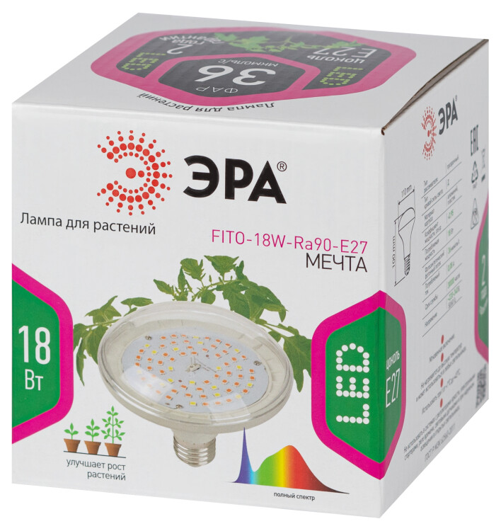 Фитолампа для растений светодиодная ЭРА FITO-18W-Ra90-E27 полного спектра 18 Вт Е27