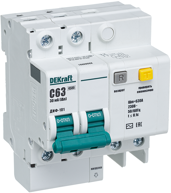 Автомат. выкл. дифф. тока 2-пол. 63А 30мА тип AC 4,5кА хар-ка С ДИФ-101