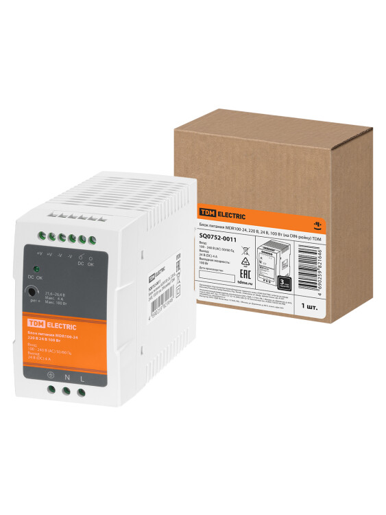 Блок питания MDR100-24, 220 В, 24 В, 100 Вт (на DIN-рейку) TDM