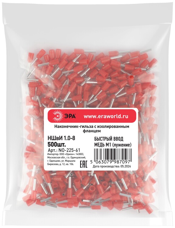 Наконечник-гильза ЭРА NO-225-61 НШвИ 1,0-8 с изолированным фланцем (упаковка 500 шт.)