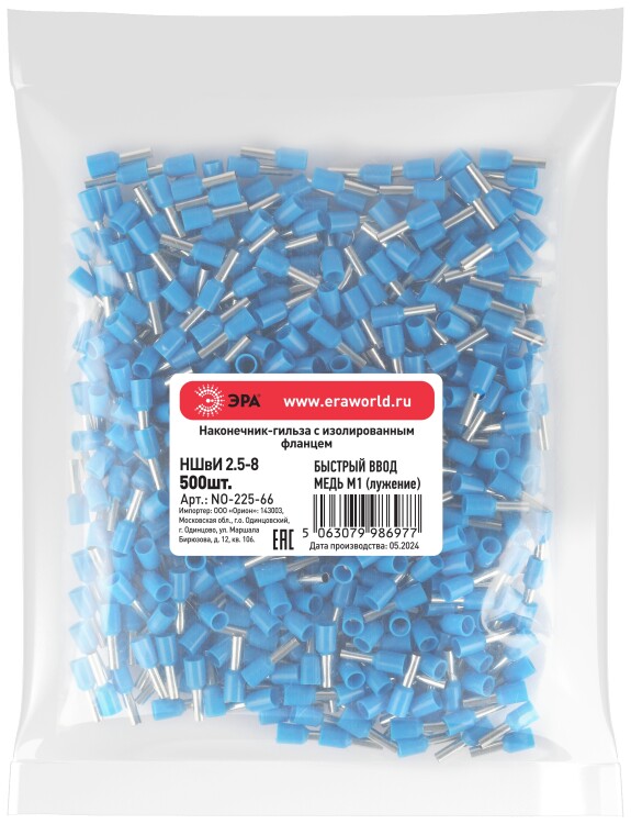 Наконечник-гильза ЭРА NO-225-66 НШвИ 2,5-8 с изолированным фланцем (упаковка 500 шт.)