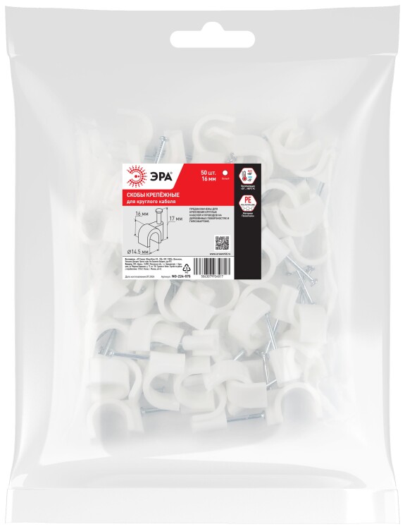 Скоба пластиковая ЭРА NO-224-575 крепежная круглая 16 мм белая (50 шт/уп)