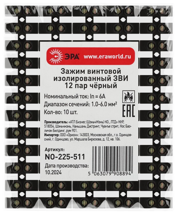 Зажим винтовой ЭРА NO-225-511 изолированный ЗВИ-нг 6А (1.0-6.0 мм2) 12 пар чёрный