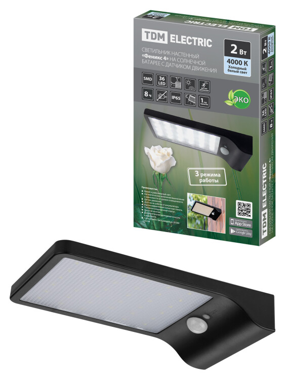 Светильник настенный "Феникс 4" на солн. батарее с датч. движ., 2 Вт, IP65, пластик, черн., TDM