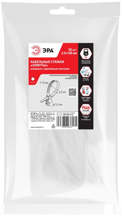 Хомут анкерный нейлоновый ЭРА NO-225-215 2.5 х 100 мм белый 50 штук