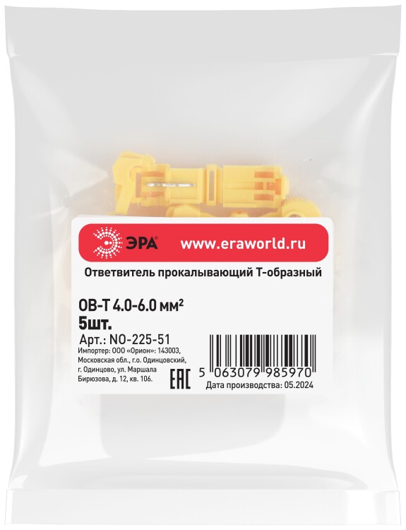 Ответвитель прокалывающий ЭРА NO-225-51 ОВ-Т 3 (4.0-6.0 мм2) Т-образный (упаковка 5 шт.)