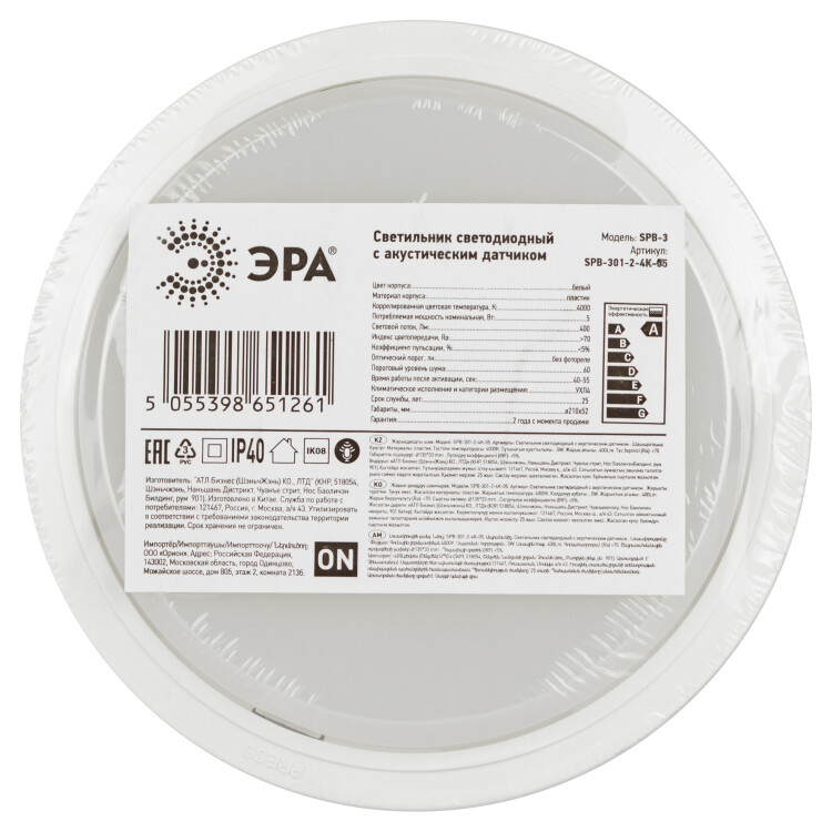 Светильник ЖКХ светодиодный ЭРА SPB-301-2-4K-05 IP40 5Вт 400Лм 4000K 135х135х33 с акустическим датчиком круг накладной