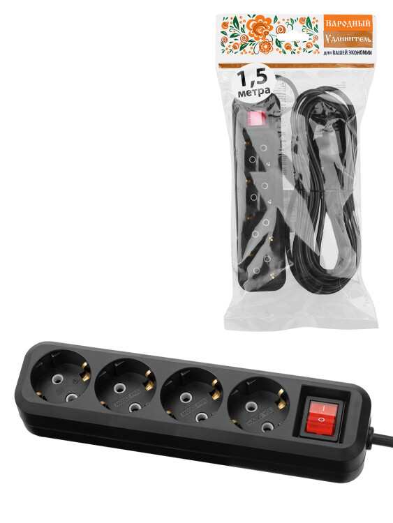 Удлинитель4гнезда,1,5метра,с/з, выкл., 10 А, 2300 Вт, черный, НАРОДНЫЙ
