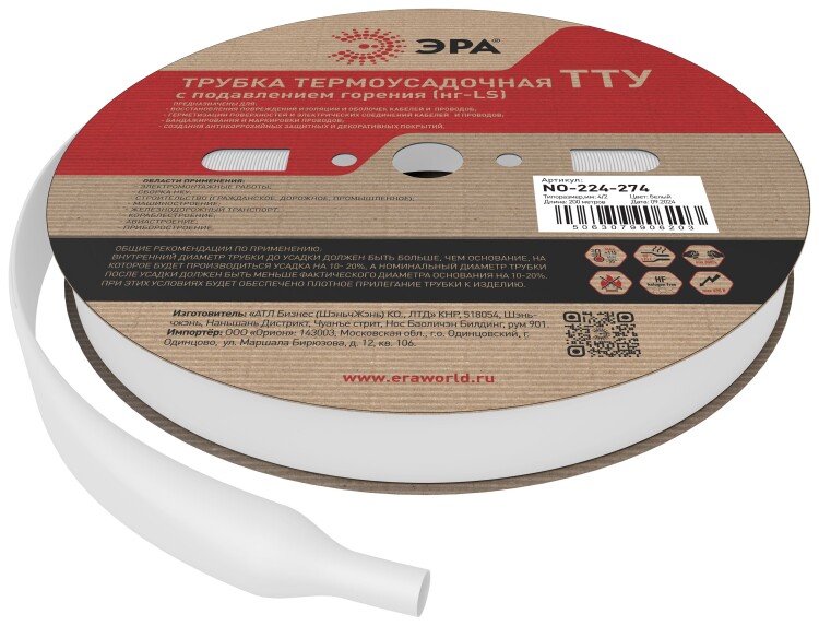 Термоусадочная трубка ЭРА NO-224-274 ТТУ нг-LS 4/2 белая (рулон 200 метров)