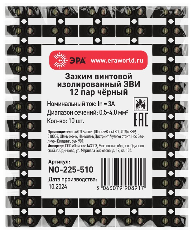 Зажим винтовой ЭРА NO-225-510 изолированный ЗВИ-нг 3А (0.5-4.0 мм2) 12 пар чёрный