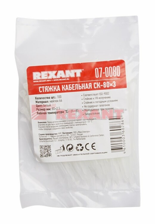 Стяжка кабельная нейлоновая 80x2,5мм, белая (100 шт/уп) REXANT