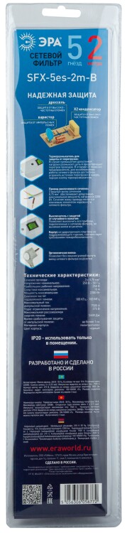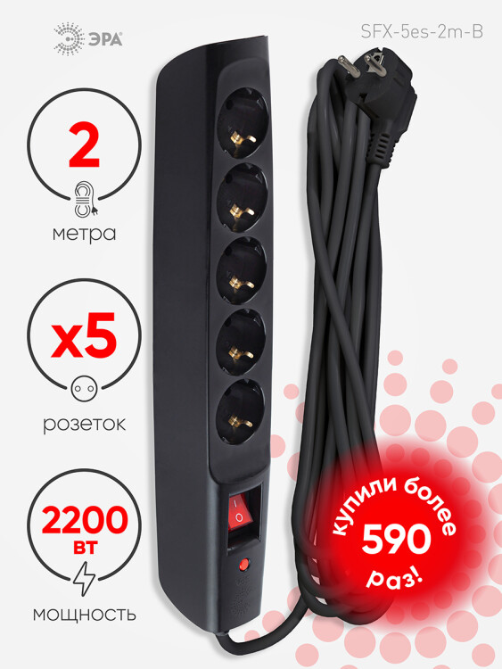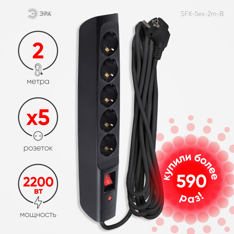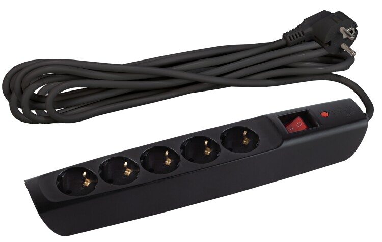 Сетевой фильтр, 5 розеток, длина 2 м, 3x0,75 мм?, 10А, с/з, IP20, термопласт, чёрный, с выключателем