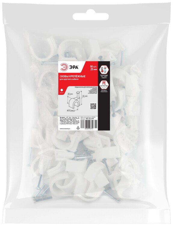 Скоба пластиковая ЭРА NO-224-579 крепежная круглая 25 мм белая (50 шт/уп)