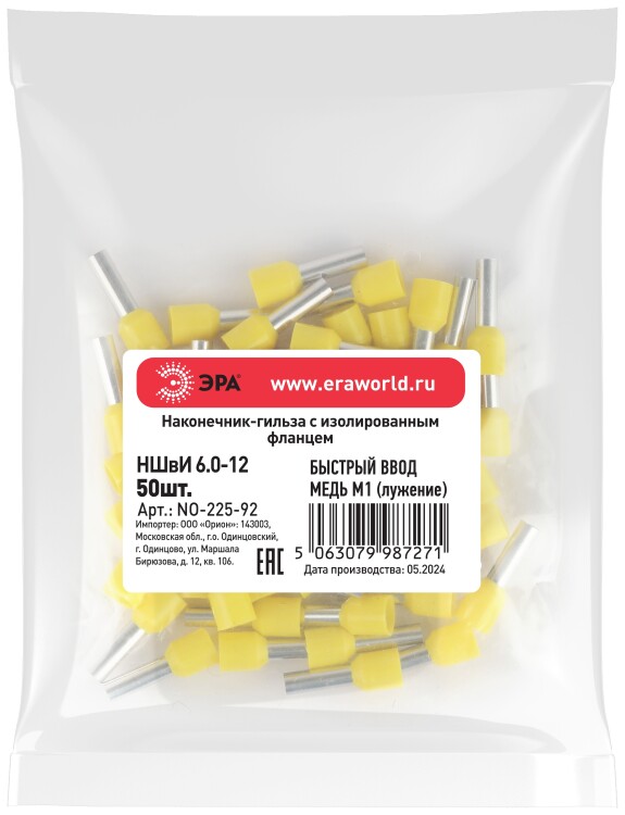 Наконечник-гильза ЭРА NO-225-92 НШвИ 6,0-12 с изолированным фланцем (упаковка 50 шт.)