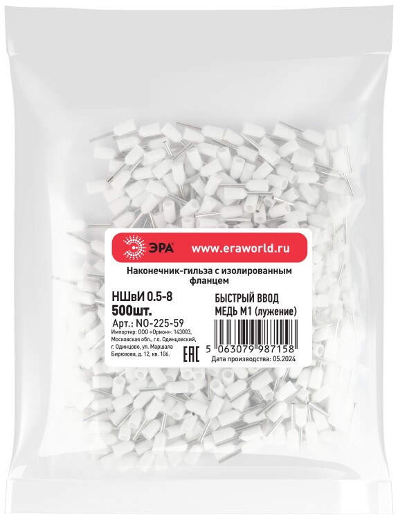 Наконечник-гильза ЭРА NO-225-59 НШвИ 0,5-8 с изолированным фланцем (упаковка 500 шт.)