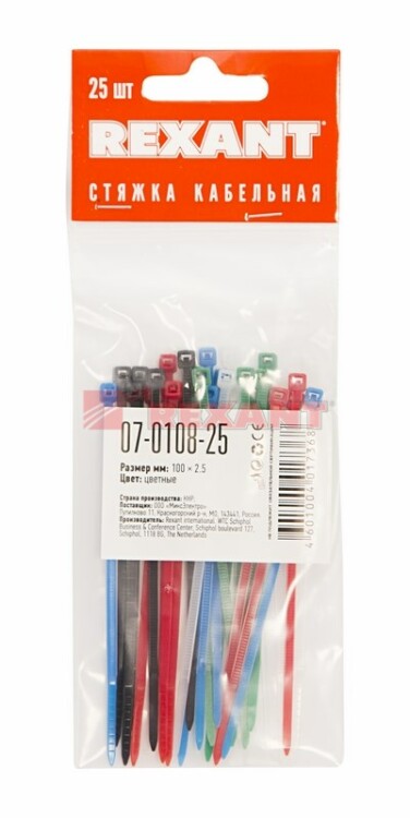 Стяжка кабельная нейлоновая 100x2,5мм, набор 5 цветов (25 шт/уп) REXANT