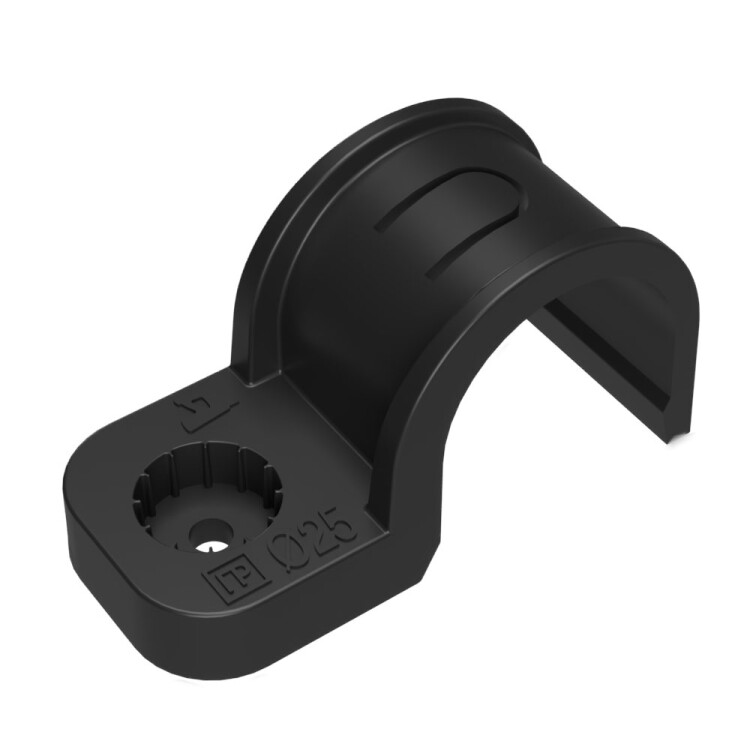 Крепеж-скоба пластиковая односторонняя для прямого монтажа атмосферостойкая черная в гофроящике d25 мм (450шт/кор) Промрукав