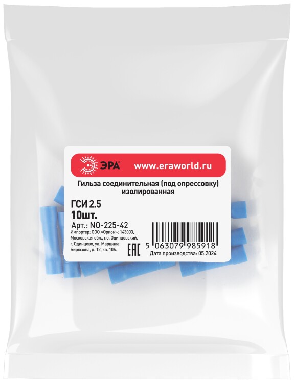 Гильза соединительная ЭРА NO-225-42 ГСИ 2.5 изолированная под опрессовку (упаковка 10 шт.)