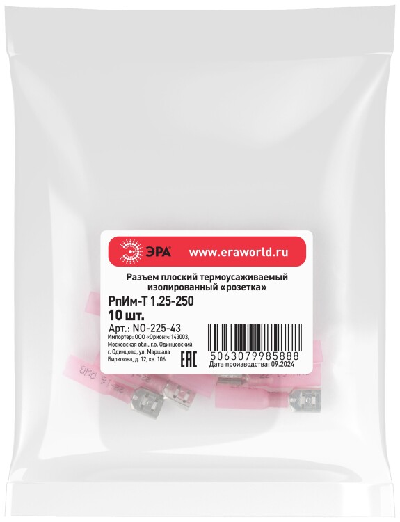 Разъем плоский термоусаживаемый ЭРА NO-225-43 РпИм-Т 1.25-250 изолированный «розетка» (упак. 10 шт.)