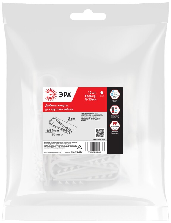 Дюбель хомут ЭРА NO-224-556 для круглого кабеля 5-10 мм белый (10 штук)