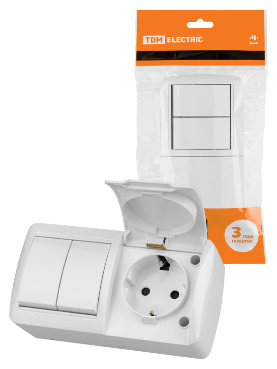 Блок выключатель 2-кл. 10А + розетка 2П+З 16А с защ. штор. с крышкой IP54 белый "Селигер" TDM