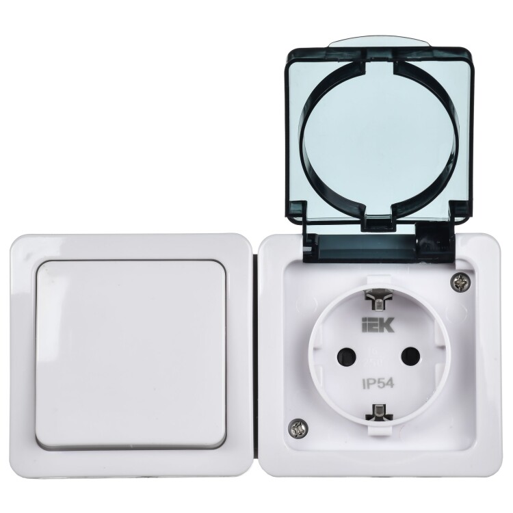 Блок выключатель 1 клавишный + 2P+E с прозрачной крышкой накладной белый IP54 IEK Гермес PLUSEBGMP20-K03-31-54-EC