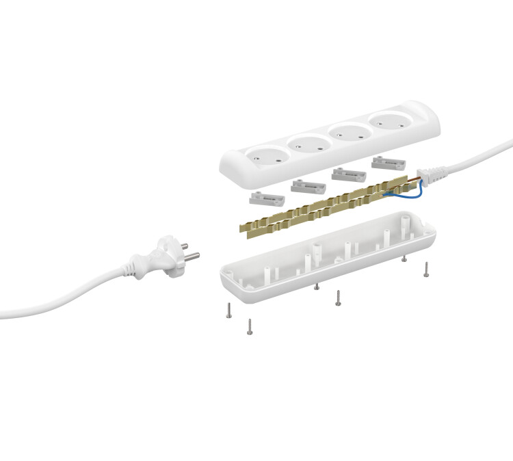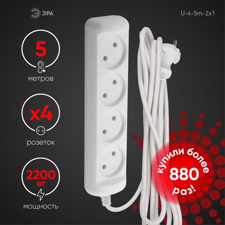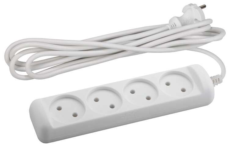 Удлинитель, 4розетки, длина 5 м, 10А, ПВС 2х1 мм², б/з, IP20, пластик, белый, U-4-5m