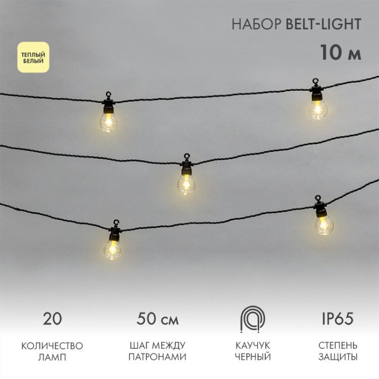 Уличная гирлянда Лофт 10м, черный каучук, 20 прозрачныx ламп, теплый белый, влагостойкая IP65