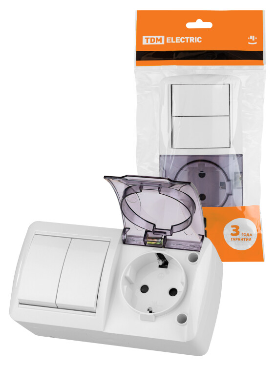 Блок выключатель 2-кл. 10А + розетка 2П+З 16А с защ. штор. с прозр. крыш. IP54 белый "Селигер" TDM