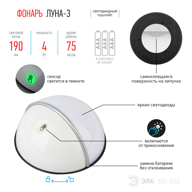 Светодиодный фонарь подсветка ЭРА Пушлайт SB-603 Луна-3 с сенсорным выключателем