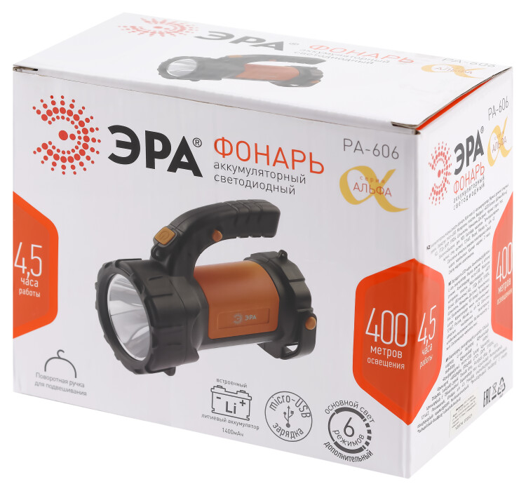 Светодиодный фонарь ЭРА PA-606 прожектор аккумуляторный 5 Вт, литий, поворотная ручка, Альфа