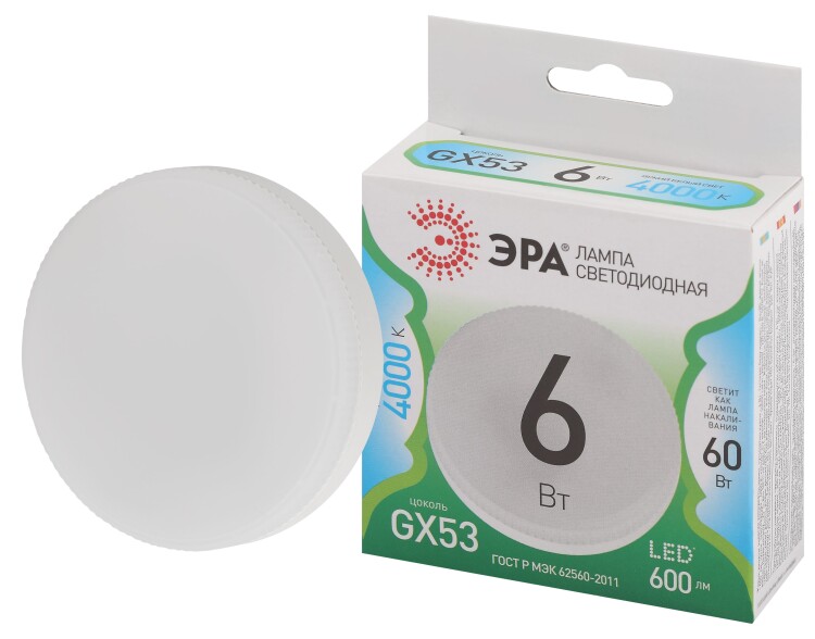 Лампочка светодиодная ЭРА LED GX-6W-840-GX53 GL GX53 6 Вт таблетка яркий белый свет