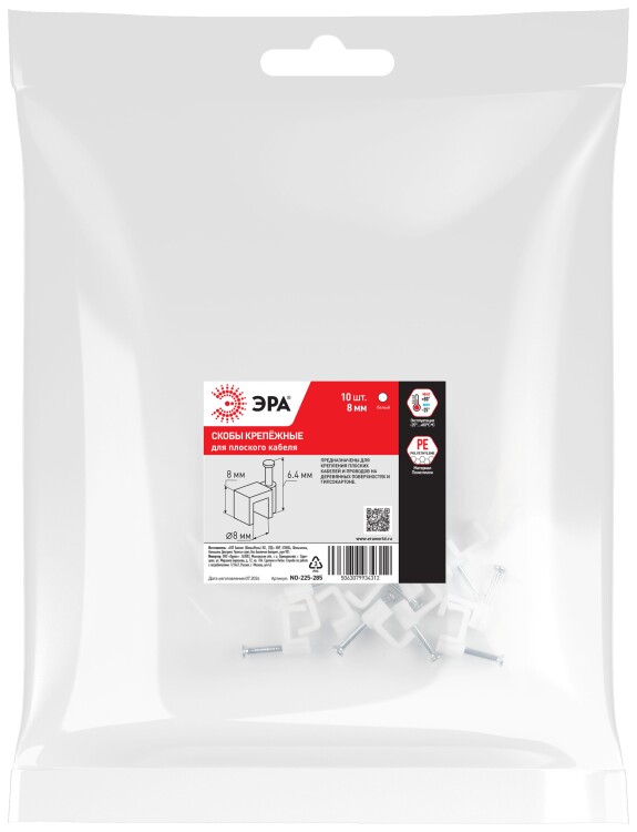 Скоба пластиковая ЭРА NO-225-285 крепежная плоская 8 мм белая (10 шт/уп)