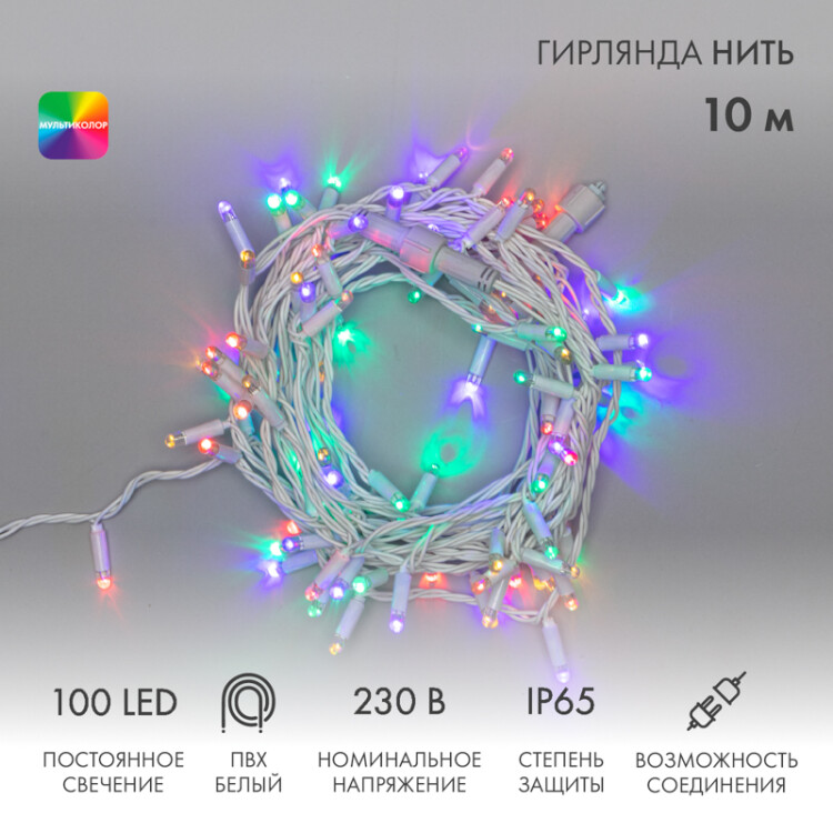 Гирлянда светодиодная Нить 10м 100 LED МУЛЬТИКОЛОР белый ПВХ IP65 постоянное свечение 230В соединяется нужен блок 303-500-1 NEON-NIGHT