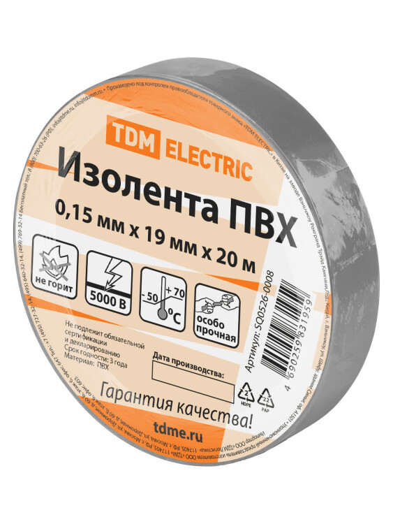 Изолента ПВХ 0,15х19 мм Серая 20 м TDM