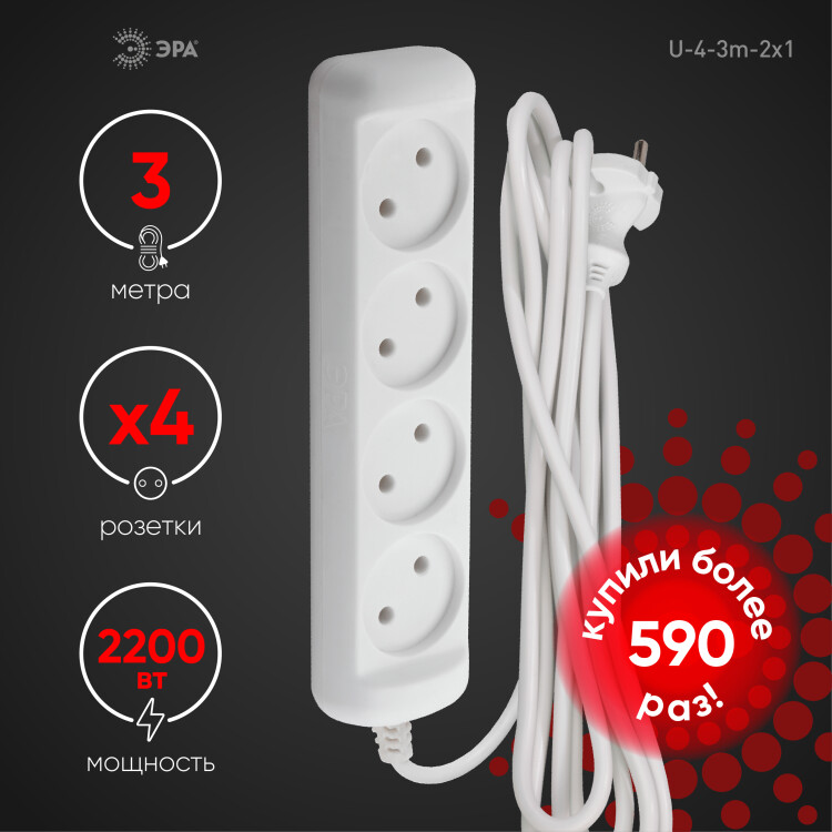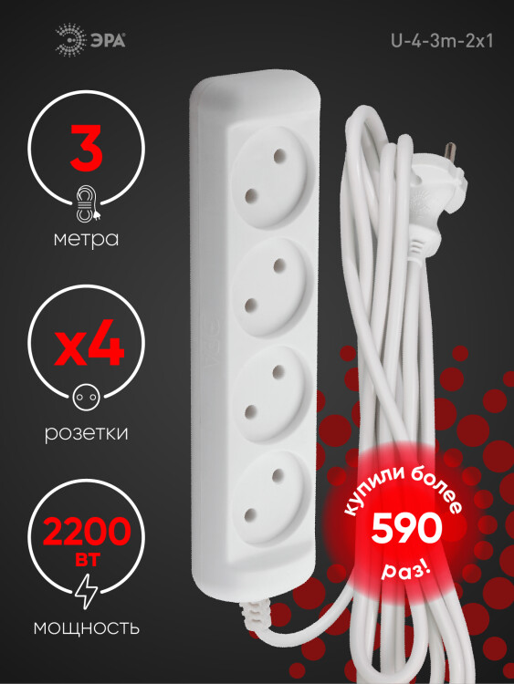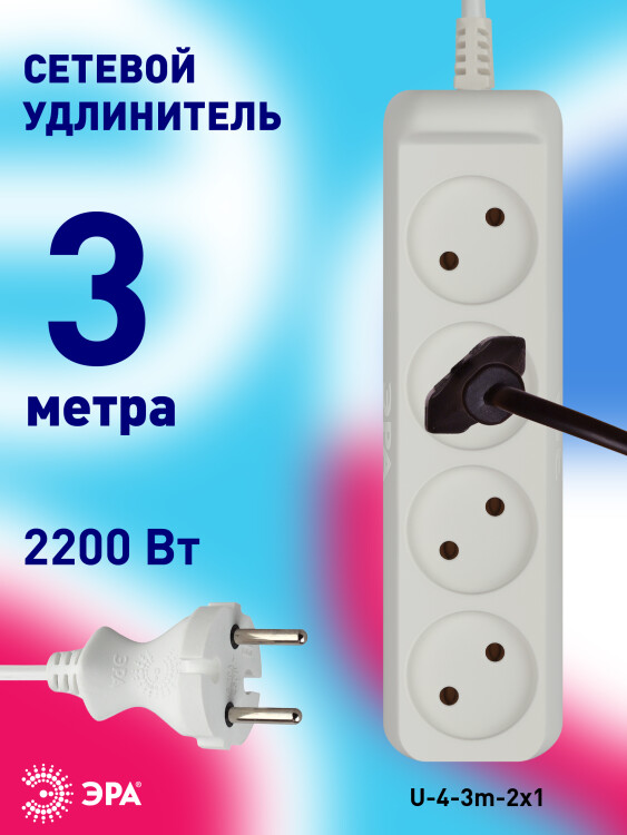 Удлинитель, 4розетки, длина 3 м, 10А, ПВС 2х1 мм², б/з, IP20, пластик, белый, 10АU-4-3m