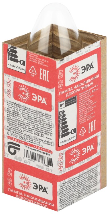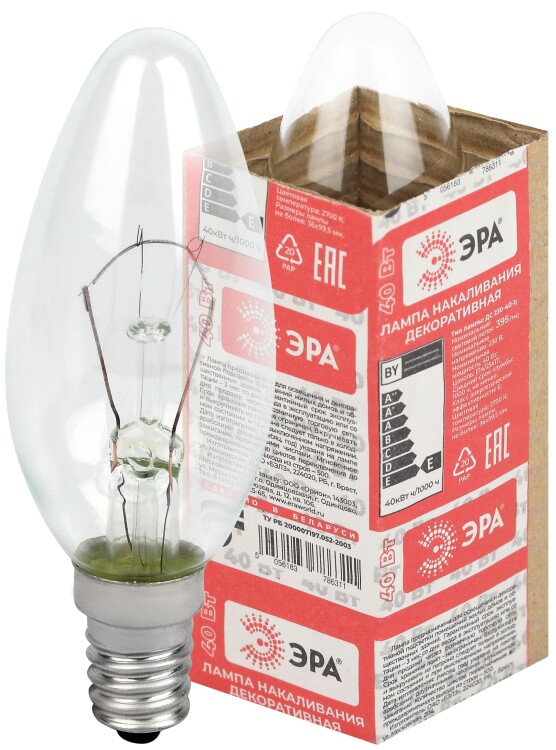 Лампочка ЭРА B36 40Вт Е14 / E14 230В свечка прозрачная в гофре