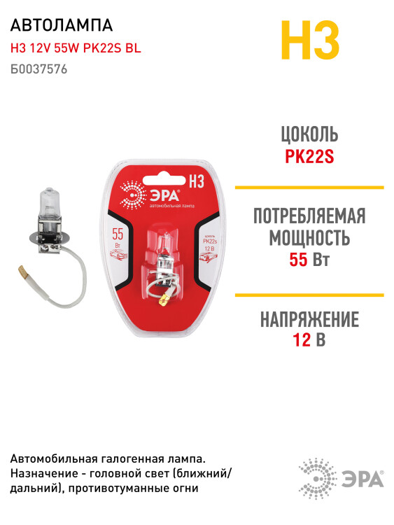 ЭРА Автолампа Н3 12V 55W PK22s BL (лампа головного света, противотуманные огни) (10/100/2700)