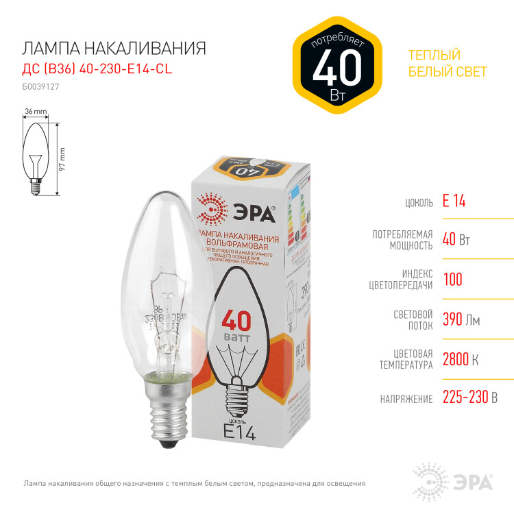Лампочка ЭРА B36 40Вт Е14 / E14 230В свечка прозрачная цветная упаковка