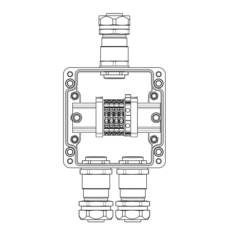 Взрывозащищенная клеммная коробка из полиэстера TBE-P-03-(4xCBC.4-1xTEO.4)-2xKAEPM3MHK-20(A)-1xKAEPM3MHK-20(C)1Ex e IIC Т5 Gb / Ex tb IIIC T95°C Db IP66/КЗ