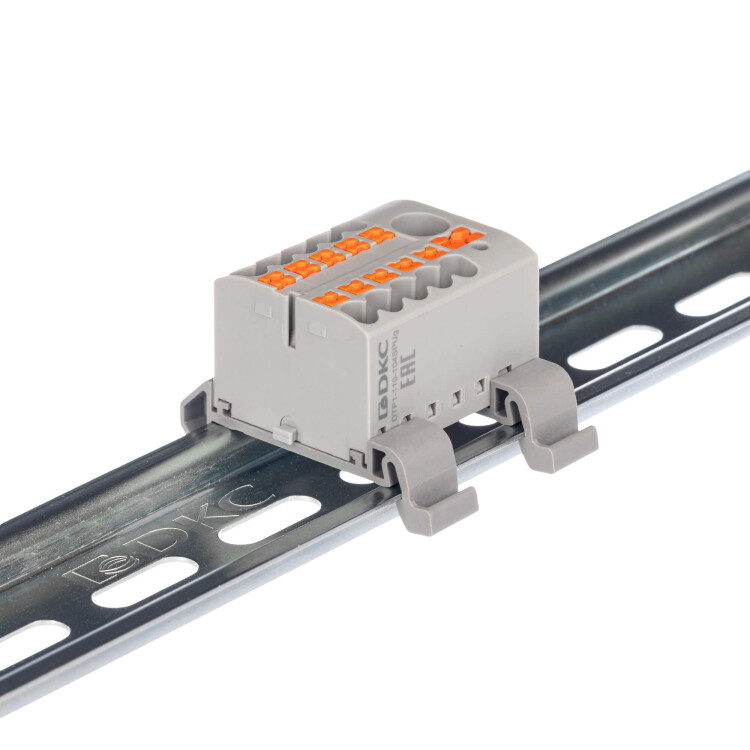 Блок распределительный с гориз. адаптером на рейку шириной 35мм, зажим push-in, 1 ввод 6 кв.мм, 10 точек подключения 2,5 кв.мм, серый
