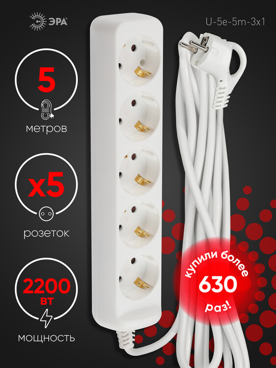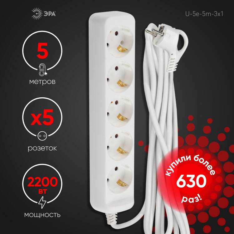 Удлинитель, 5розеток, длина 5 м, 16А, ПВС 3х1 мм², с/з, IP20, пластик, белый, U-5e-5m